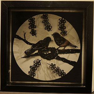 Cuadro hecho con el método del Kirigami. Representa a dos gorriones posados en la rama de un árbol. Se están ocupando de su nido. Están rodeado de varios ramilletes de flores.